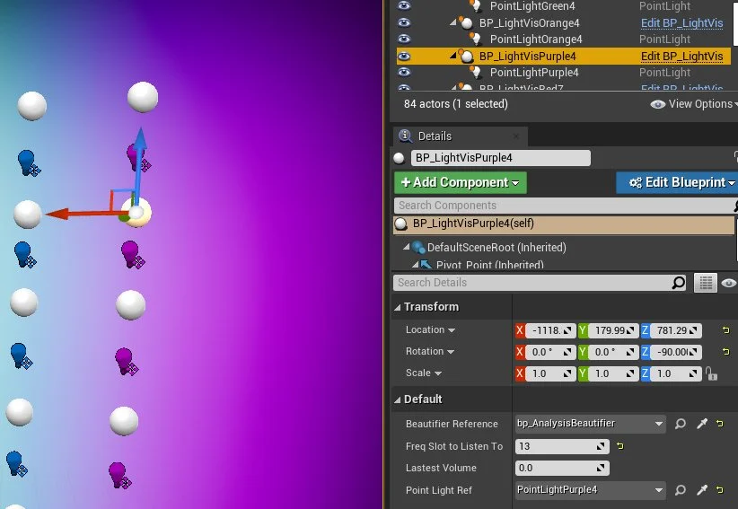 I remember having issues with implementing a point light directly into the blueprint actor I created, but with this setup of mine I could individually assign the blueprint actor to a specific “Point Light Ref,” assign what frequency slot the point light should listen to, and simply assign the point light’s color directly in the world.