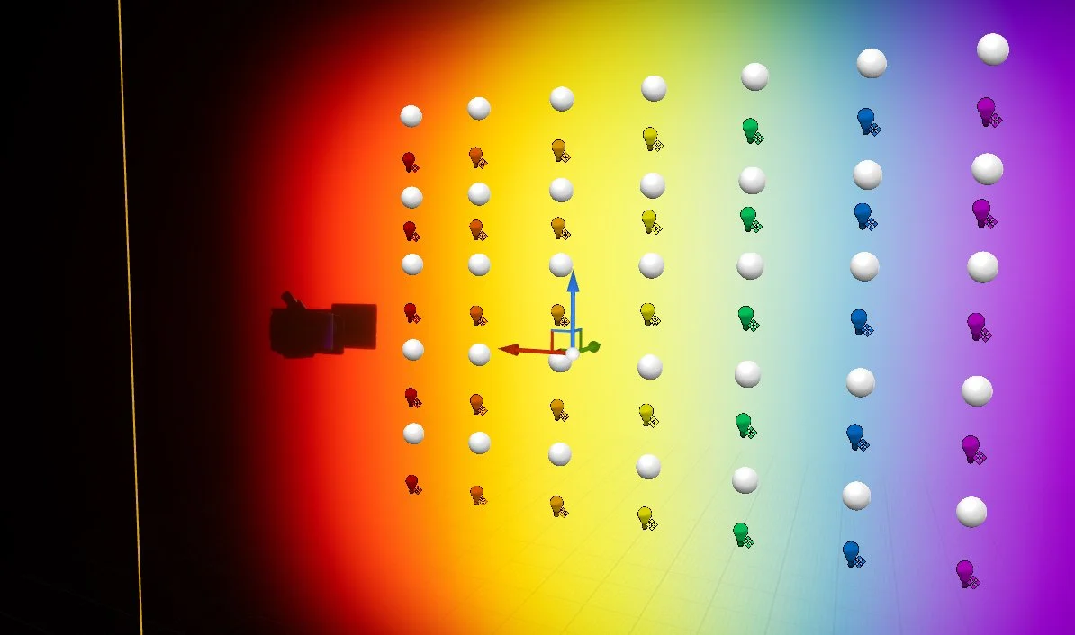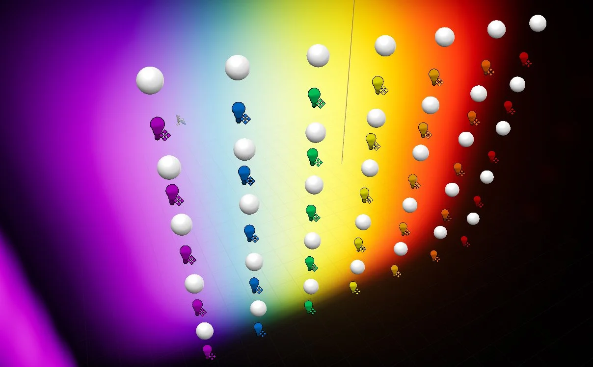 To set up the light orchestration, I backlit a semi-translucent screen (plane), arranged lights to have five rows of seven (5 octaves, each with a scale of 7), and then assigned light colors as the ROYGBIV spectrum.