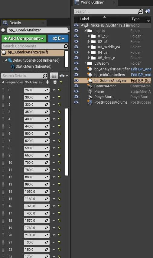 Within the SubmixAnalyzer is an array list of “Frequencies to Analyze,” and here is where I dictated what frequency each individual light would get set to listen to. There were 35 lights, so the list had 35 frequency slots to listen to, which I organized based off of Rimington’s calculations.