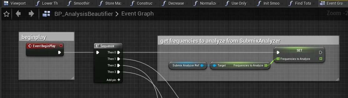 In Arthur Barthur’s project (which is free) there are a lot of tools available. What I made use of was their midi interface setup, and their audio analysis tools “AnalysisBeautifier” and “SubmixAnalyzer.”